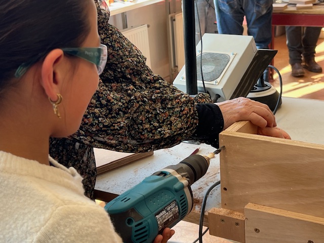 In de workshop leren ze afmeten, zagen met de handzaag en decoupeerzaag. Gaten (voor)boren en het maken van verbindingen zoals een schroefverbinding en een deuvel verbinding.